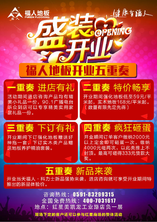 五重奏 新品来袭:开业单天,福人科力士新品强势来袭,进店咨询就可享受开业期间特推出的新品体验价。