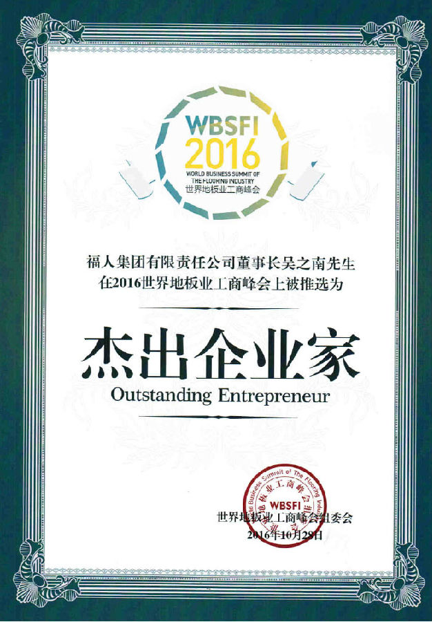 福人集团有限责任公司董事长吴之南先生荣获2016世界地板业工商峰会“杰出企业家”称号。