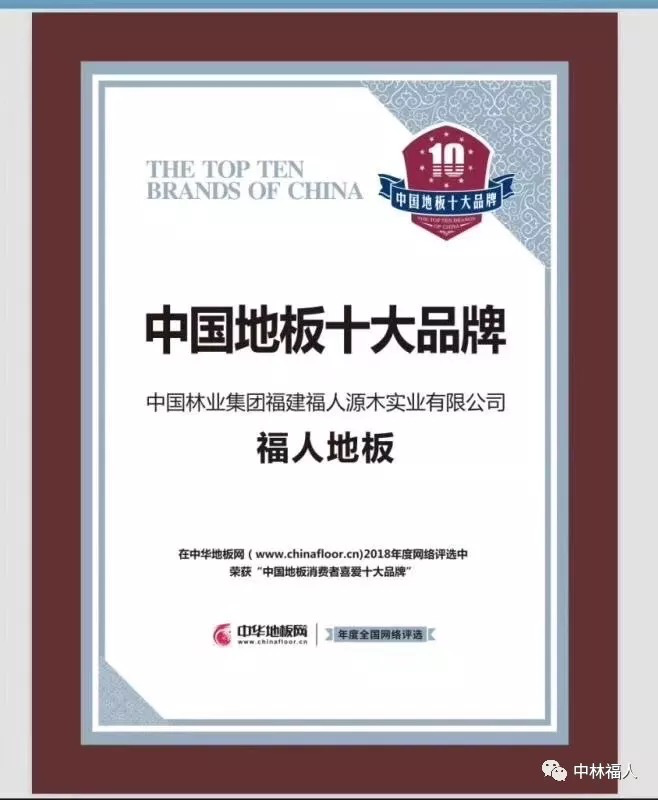 由中华地板网举办的2018年“中国地板消费者喜爱十大品牌”评选活动,于2018年9月10日尘埃落定,福人地板跻身地板行业“十大品牌”之列,荣获“2018中国地板消费者喜爱十大品牌”称号。